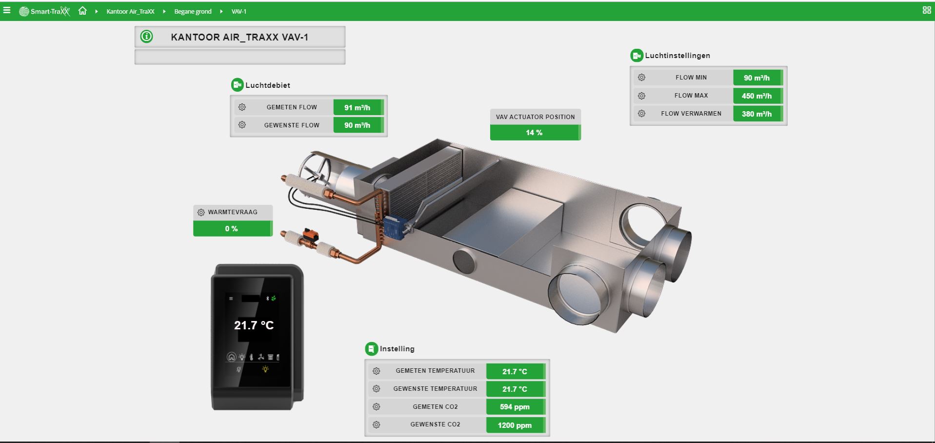 Behalve het ontwerpen en realiseren van meet- en regelsystemen voor gebouwgebonden installaties is Air-Traxx ook leverancier van oplossingsgerichte ventilatieproducten met geïntegreerde meet- en regeltechniek. “Onze kracht is het bieden van complete oplossingen, van thermostaat tot geavanceerde gebouwbeheersysteem, maar ook van luchtbehandelingskasten tot inblaasroosters,” verduidelijkt Smit. “We zijn voornamelijk actief in de utiliteit, van kleine kantoren tot grote distributiecentra. Behalve in Nederland is ons concept ook opgemerkt in China, waar we momenteel grote kantoorparken tot wel 400.000 m2(!) voorzien van intelligentie.”