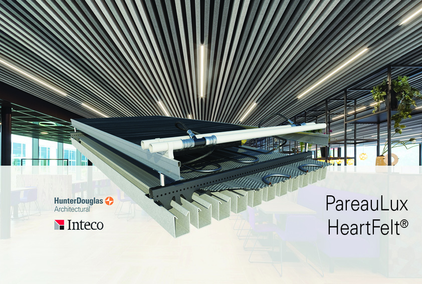 Het PareauLux klimaatplafond is het resultaat van een samenwerking van twee topspelers in de klimaat- en plafondbranche: Hunter Douglas voor het onderscheidende design en materiaalgebruik van de lamellen en Inteco voor het innovatieve klimaatsysteem met een extreem hoog koelvermogen. Naast het reeds bestaande PareauLux 30BD klimaatplafond, vormt de lancering van twee nieuwe toepassingen; de Houten Grills en HeartFelt®, de kroon op de unieke samenwerking.