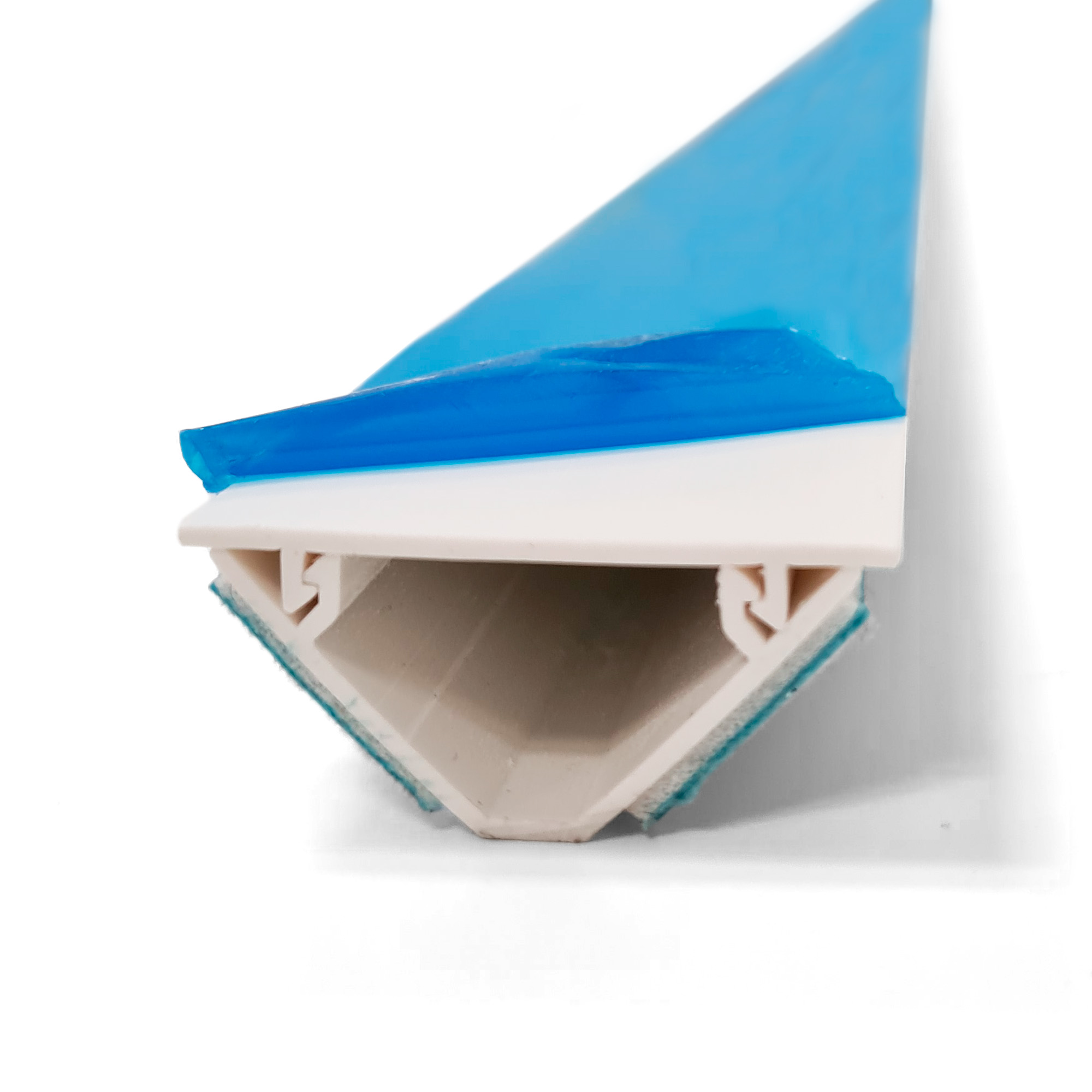 De zelfklevende driehoekige leidingkoker is zowel horizontaal als verticaal te monteren, van vloer tot plafond. Verder is het product voorzien van een deksel die strak oversteekt voor een naadloze aansluiting op muur. Ook problemen die naar voren komen met niet-haakse hoeken, worden getackeld door deze handige zelfklevende driehoek leidingkoker. De zelfklevende tape heeft een ongekend hoge kleefkracht op zowel vlakke als oneffen oppervlaktes. Waar voorheen bij het bevestigen van een leidingkoker veel stof vrij kwam, blijft dit de installateur nu dus bespaard. De zelfklevende tape vermindert niet alleen de tijd om de koker te bevestigen, ook de schoonmaaktijd voor de installateur wordt drastisch verminderd. De tape zorgt er bovendien voor dat aan de NEN-1010 voorschriften wordt voldaan. Zo kan er met enkel geïsoleerde isolatiedraden gewerkt worden.