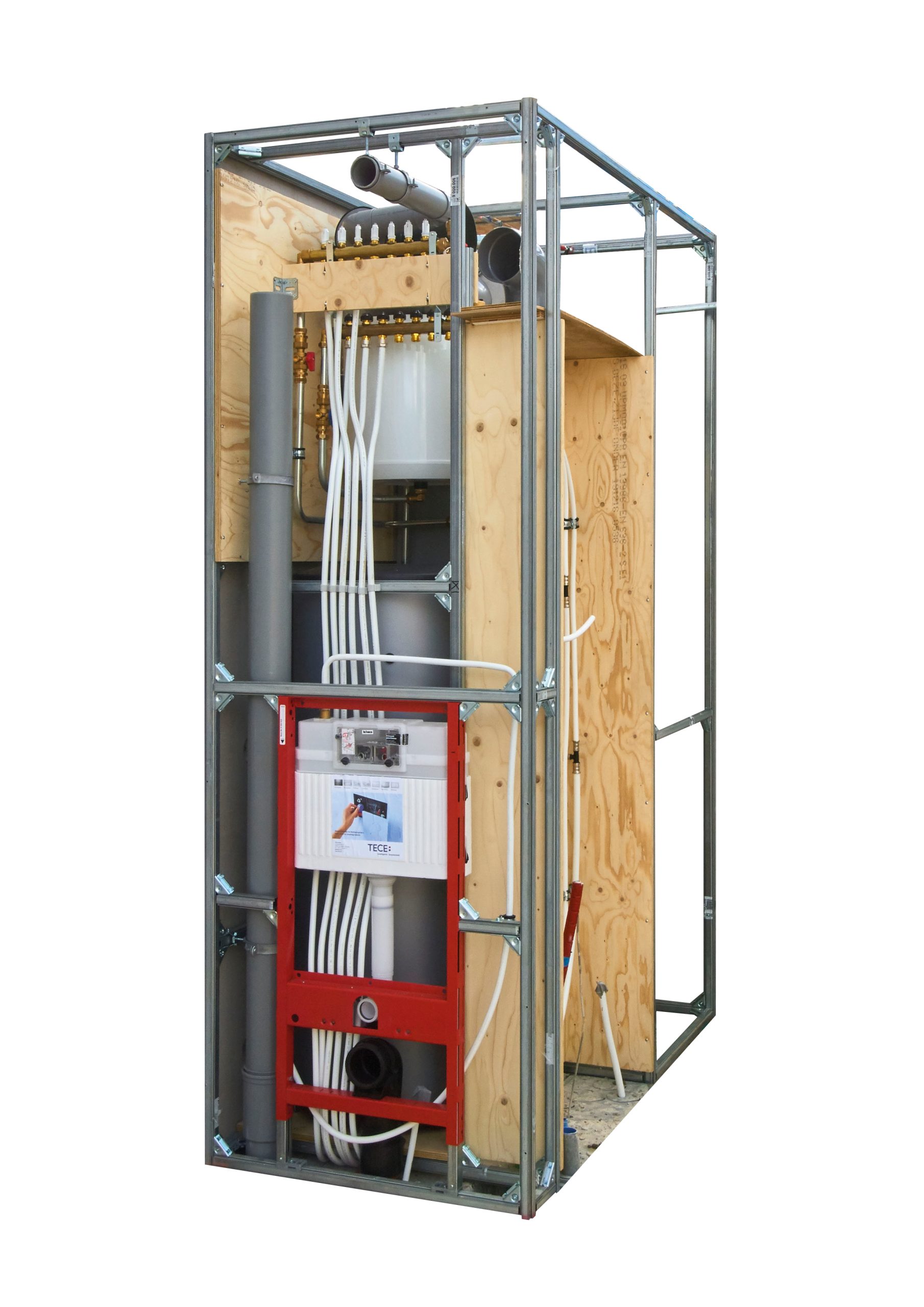 TECEprofil wordt ook toegepast voor het prefabriceren van technische ruimten in zogenaamde skids. TECE levert verschillende installatiedelen die in de skids verwerkt kunnen worden, zoals een wc-inbouwframe, wc-bedieningsplaten en het push-fit leidingsysteem TECElogo.